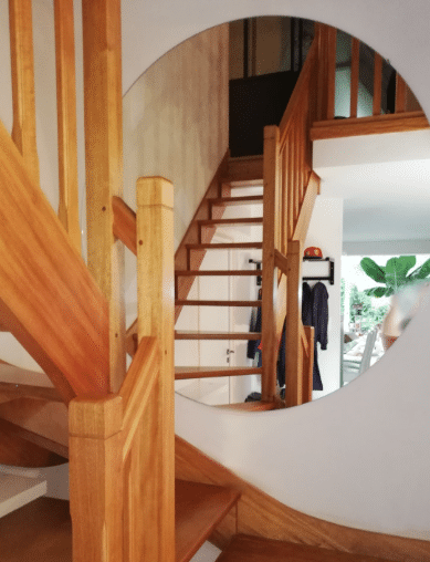 Dans la cage d’escaliers de cette maison à Landerneau, nous avons collé sur le mur un miroir de forme ronde, d’épaisseur 6 mm, avec un joint plat poli en périphérie.