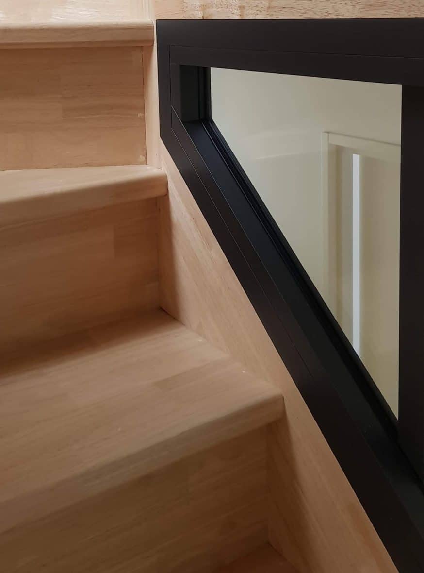 Ce garde-corps est composé d’un vitrage de type feuilleté afin de de retenir une personne en cas de chute.