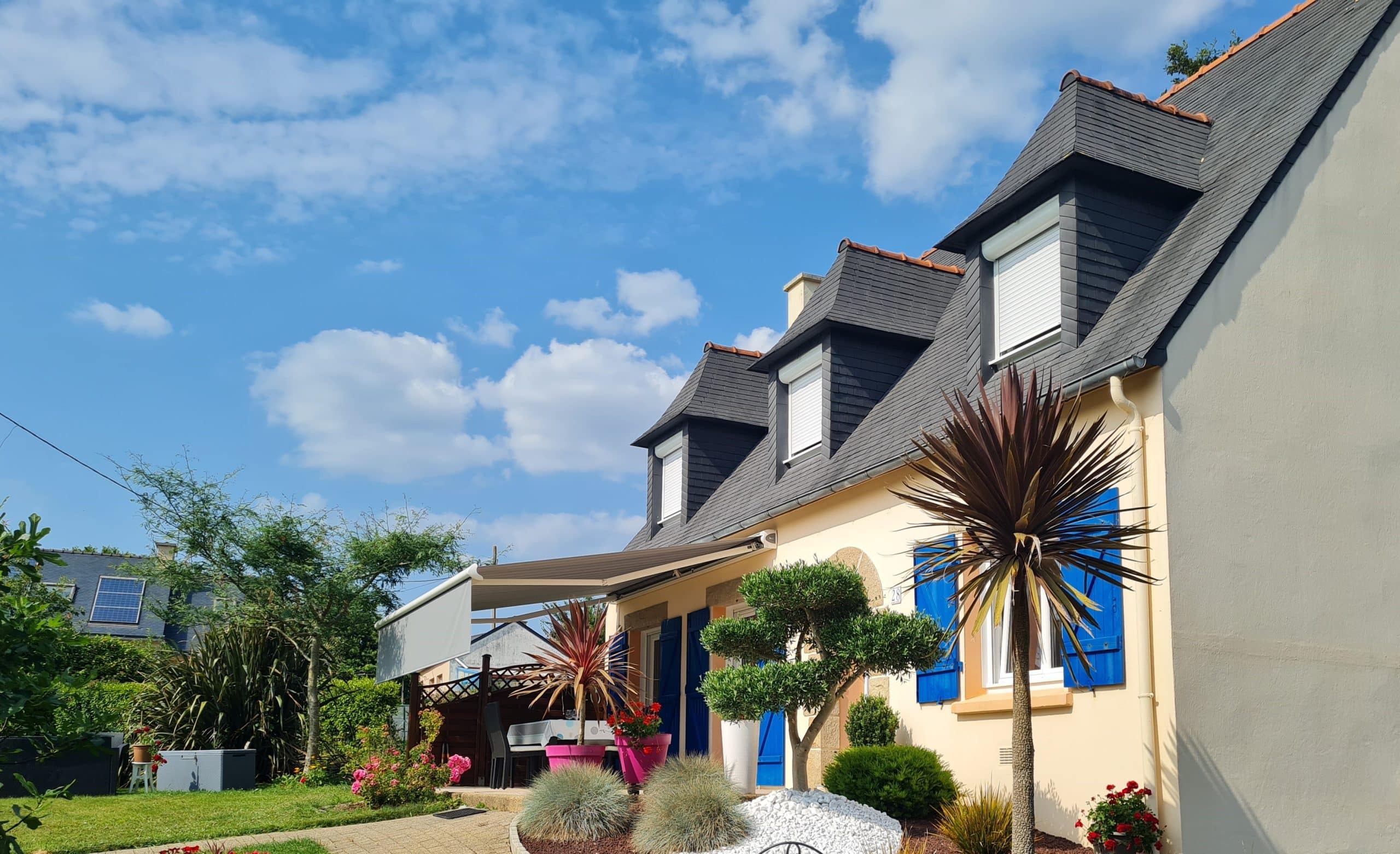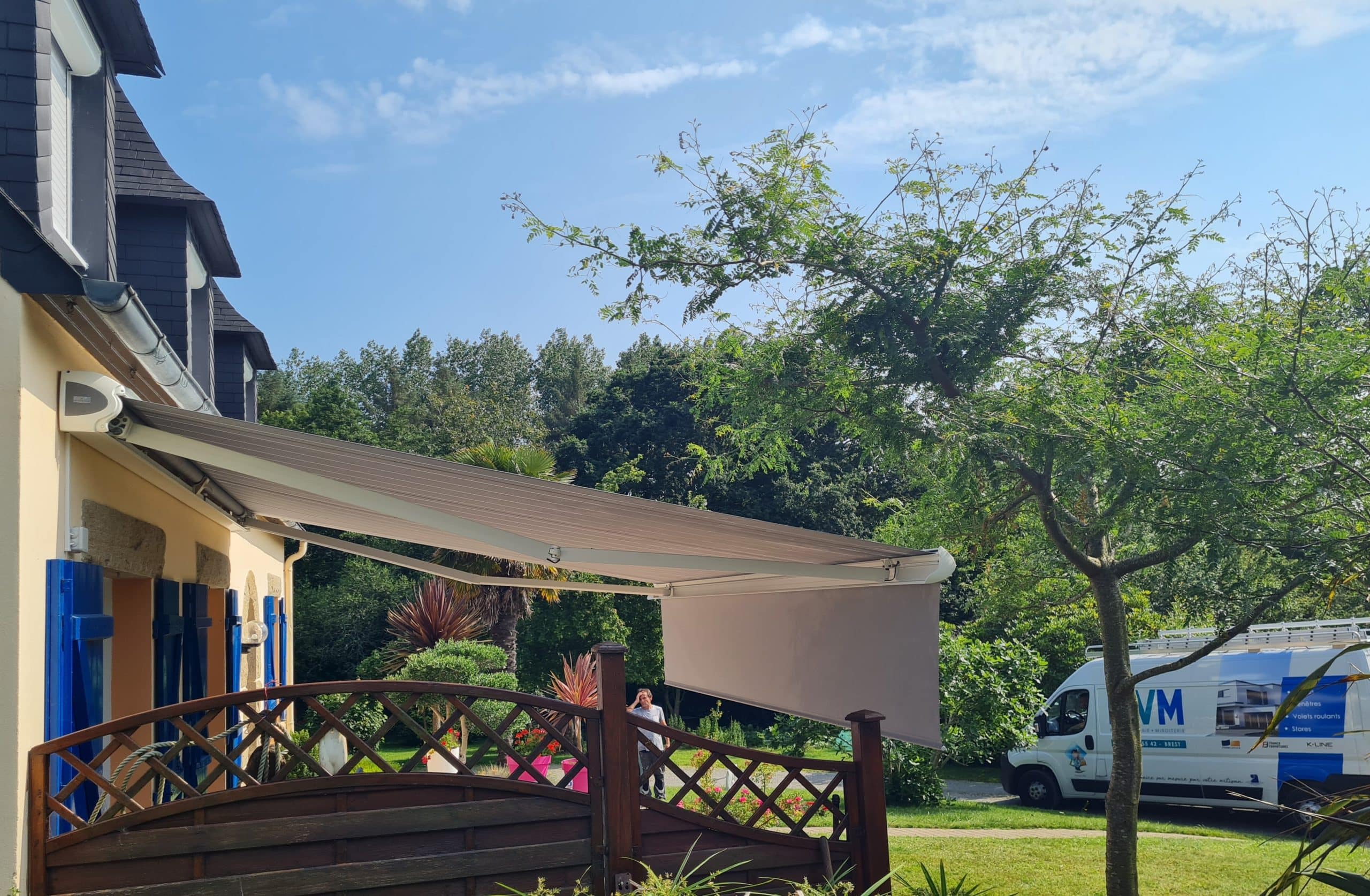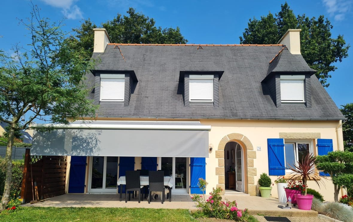 Côté terrasse, nous avons réaliser la fourniture et la pose d’un store banne électrique de dimensions : Longueur = 5,00 m x Avancée = 3,50 m. Grâce à de telles dimensions, l’ensemble de la terrasse est couverte. La maison étant exposée sud / sud-ouest, nous avons recommandé à notre client d’installer un lambrequin électrique en bout de store banne afin de ne pas être gêné par un soleil rasant et ainsi de pouvoir profiter de la terrasse en fin de journée.