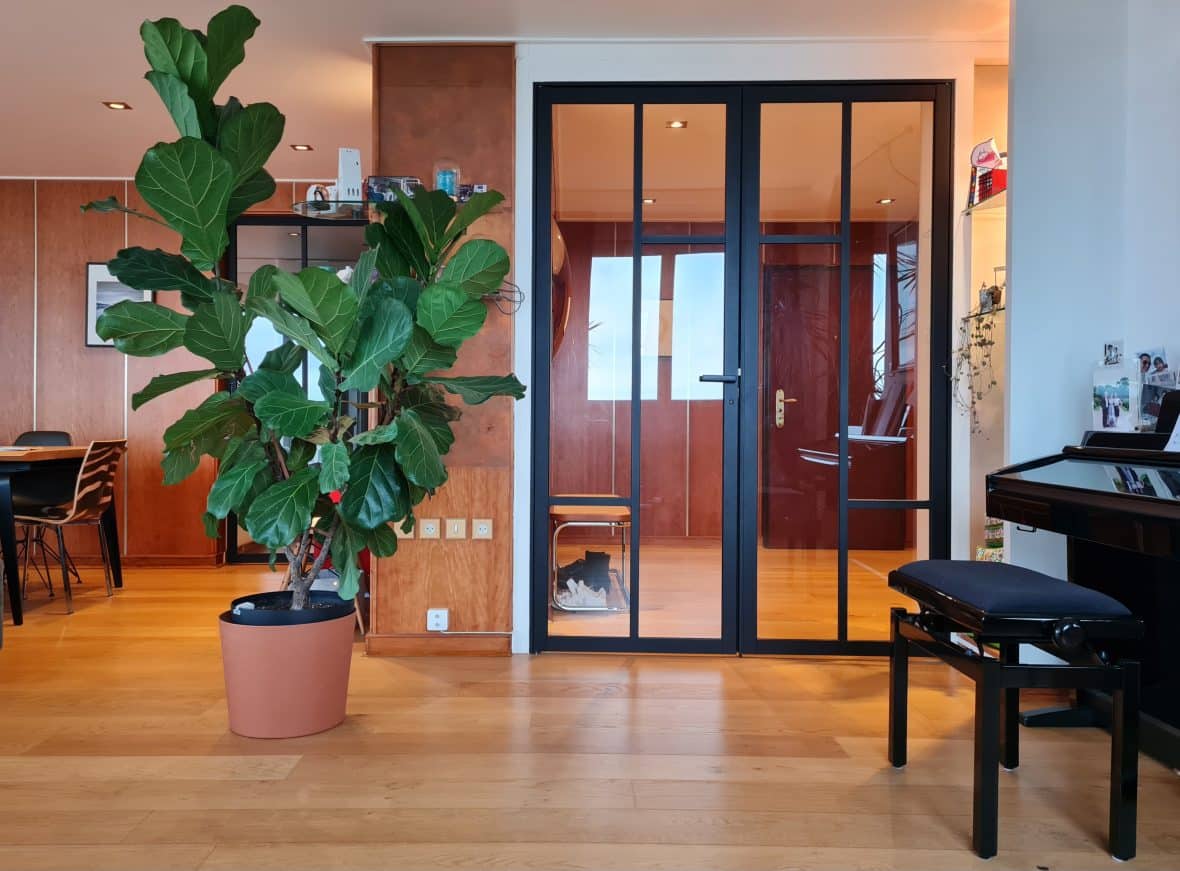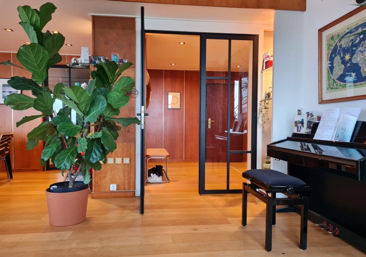 La première verrière est une verrière à double porte sur pivot. Elle s’ouvre sur le séjour et permet un passage libre total depuis l’entrée.
