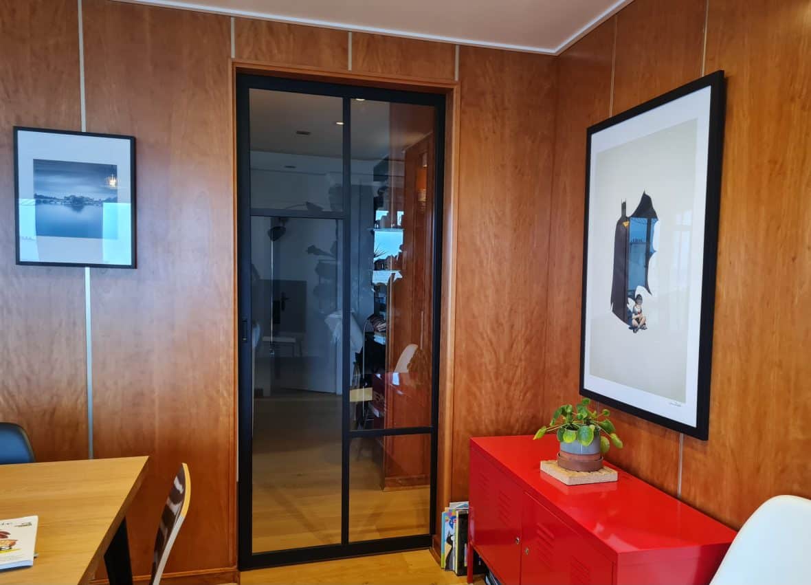 Au-delà d’apporter du cachet à cet appartement, les deux verrières permettent de cloisonner ou de décloisonner l’espace vie des couloirs situés à proximité.